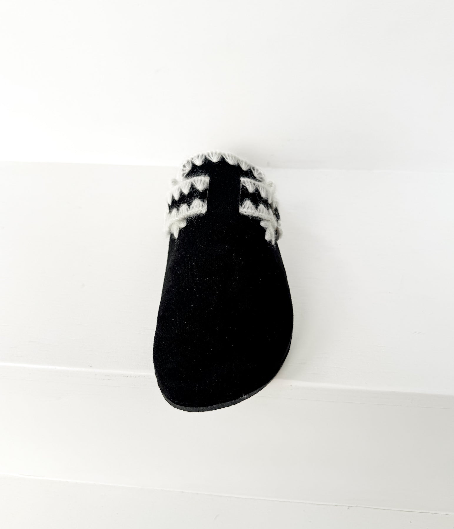 Black brushed upper with thick gauge white embroidery and a brass adjustable buckle