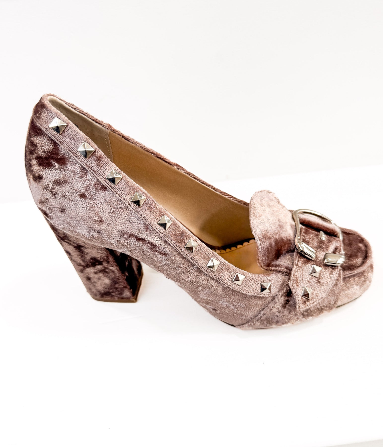 A vintage-glam buckle gives the front a little drama, while the line of delicate studs along the collar adds just the right amount of edge. It’s a heel that feels flirty, polished, and effortlessly feminine — whether you’re stepping into a dinner date, a boutique event, or just treating yourself to a moment that feels a little extra.