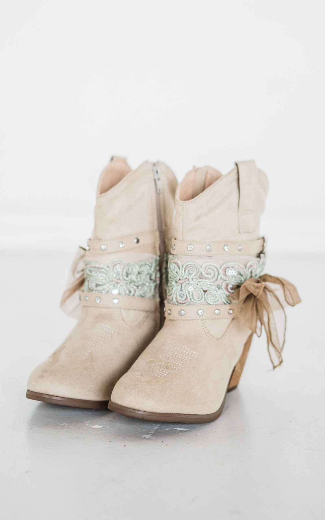 Stash Cream blends rustic charm with feminine detail for a standout everyday boot. Crafted in a rich tan suede, this ankle boot features layered buckle straps accented with subtle studs and a sparkling sequin panel for just the right touch of shine. A soft tulle bow adds a romantic, unexpected finish, while the stacked heel provides comfortable lift and all-day wearability. Versatile and eye-catching, Stash Tan pairs effortlessly with denim, dresses, or skirts—perfect for adding a little flair to your fall and year-round wardrobe.